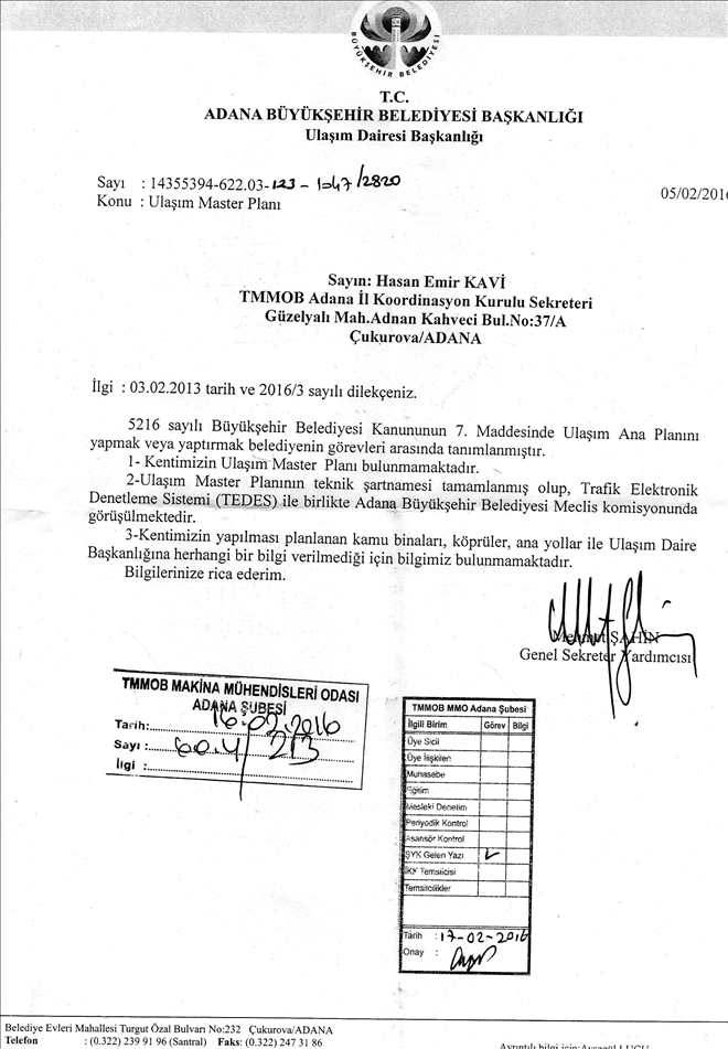 "1-Öncelikle Adana Ulaşım Master Planı yapılmalıdır. Bu plan mekansal planlama kademeleri uyarınca nazım imar planı ile eşgüdümlü olarak ele alınmalı, ulaşım sektöründe hizmet veren ve hizmet alanların etkin katılımı ile ayrıntıda bilimsel araştırma yöntem ve teknikleri kullanılarak üretilecek bilgi veri tabanına dayandırılmalıdır.