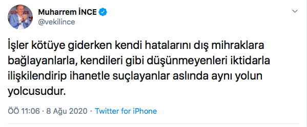 İnce "İşler kötüye giderken kendi hatalarını dış mihraklara bağlayanlarla, kendileri gibi düşünmeyenleri iktidarla ilişkilendirip ihanetle suçlayanlar aslında aynı yolun yolcusudur" diye yazdı.