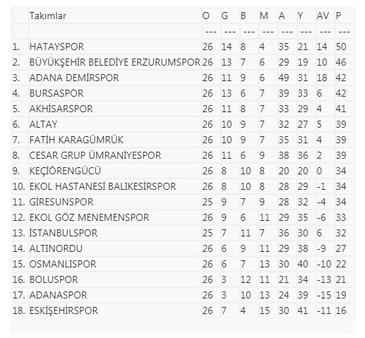 TFF 1. Lig’de 26. hafta müsabakalarının ardından oluşan puan durumu şöyle: