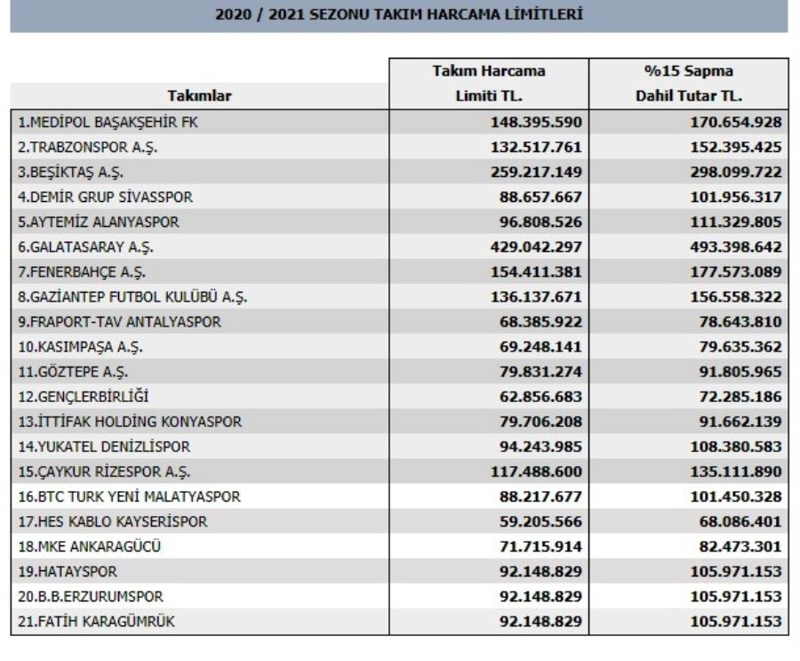 Galatasaray, 439 milyon lira ile en fazla para harcamaya sahip takım. Başakşehir'e ise 170 milyon limit tanındı. En az bütçe ise 59 milyon ile Kayserispor'da.
