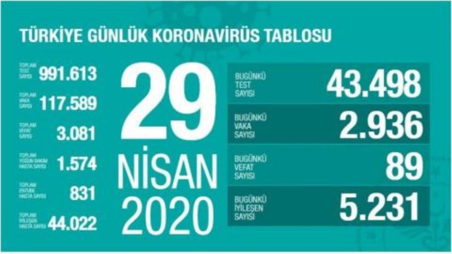 Buna göre Son bir günde 2 bin 936 kişinin koronavirüs testi pozitif çıktı ve toplam vaka sayısı 117 bin 589'a yükseldi.