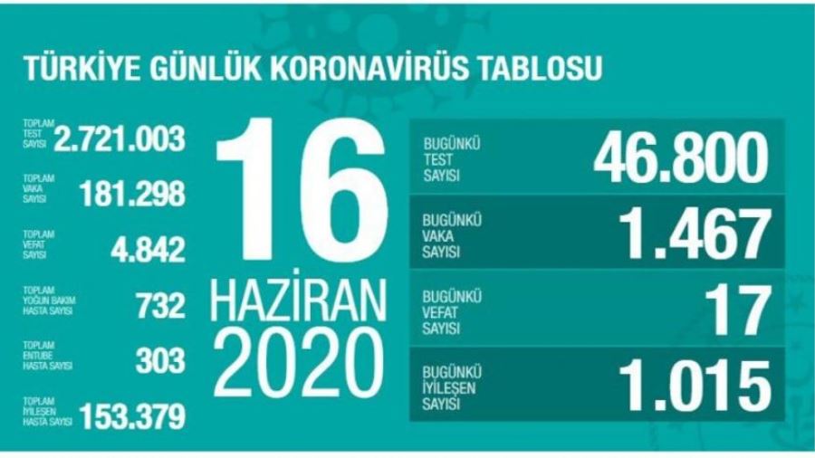 Sağlık Bakanı Fahrettin Koca bugünkü koronavirüs vakalarını açıkladı. Türkiye'de son 24 saatte 1467 kişiye Covid-19 tanısı konuldu, 17 kişi hayatını kaybetti, toplam vaka sayısı 181 bin 298, can kaybı 4 bin 842 oldu.