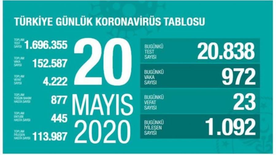 Yeni vaka sayısı ise binin altına düşerek 972 oldu. Toplam vaka sayısı 152 bin 587'ye yükselirken, bugün iyileşen 1092 hasta ile birlikte toplam iyileşen hasta sayısı 113 bin 987 oldu.