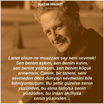 “Bizim de herkes gibi bir yuvamız, cici bici bir evimiz olsun istemez misin Nazım? Her akşam ben evimizde seni bekleyeyim, huzur içinde yaşayalım. Sana mı kaldı dünyayı düzeltmek?”