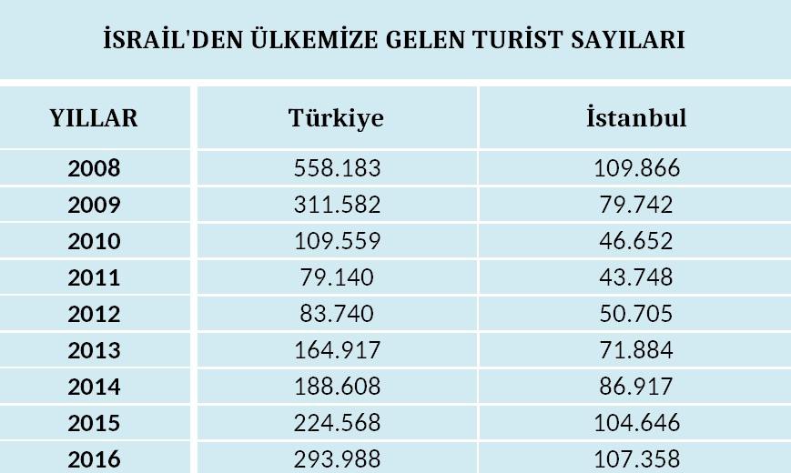 Türkiye ve İsrail ilişkilerinde başlayan normalleşmenin ardından Tel Aviv´de gerçekleştirilen Uluslararası Akdeniz Turizm Fuarı´nda (IMTM) alınan sonuçlar, İsrail turizm pazarıyla ilgili beklentileri artırdı. Türkiye´nin 7 yıl aradan sonra ilk kez bakanlık düzeyinde katıldığı fuar sonrasında İsrail´den gelen turist sayısında hızlanma bekleniyor. Türkiye Otelciler Birliği´nin (TÜROB) yaptığı değerlendirmeye göre, bu yıl İsrail´den gelen turist sayısı 400 bine ulaşabilir. İsrail, geçen yıl turizmde artış gösteren nadir ülkeler arasında yer almıştı. 2016 yılında Türkiye´ye gelen turist sayısı yüzde 30 düşerken, İsrail´den gelen turist sayısı ise yüzde 30 artarak 294 bin kişiye ulaşmıştı.