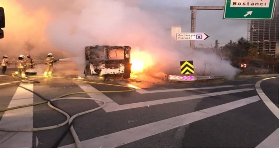 İstanbul’da TEM Otoyolu Ataşehir-Kadıköy yönü Bostancı sapağında bir halk otobüsü alev aldı. 07.00 sıralarında meydana gelen olayda şoför otobüsün yandığını fark etti. Otobüsün sürücüsü aracını sağa çekerek itfaiye ekiplerine haber verdi. Olay yerine gelen itfaiye ekipleri alevler içerisinde kalan halk otobüsünü güçlükle söndürdü. Otobüsün yandığı esnada araçta yolcuların bulunmaması olası bir faciayı önledi. Alev alan otobüs kül olurken, TEM Kadıköy yönünde trafik oluştu.