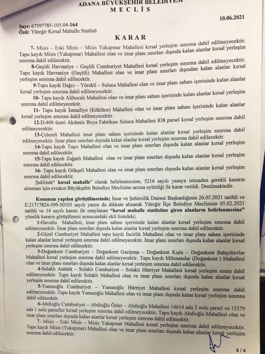 Adana'nın 13 ilçesinde kırsal mahalle ve kırsal yrleşik alanları belirlendi. Önce ilçöe belediyeleri ardından da Adana Büyükşehir Belediye Meclisinde, belirlenen kırsal mahalle ve kırsal yerleşim yerleri oy birliği ile geçti.